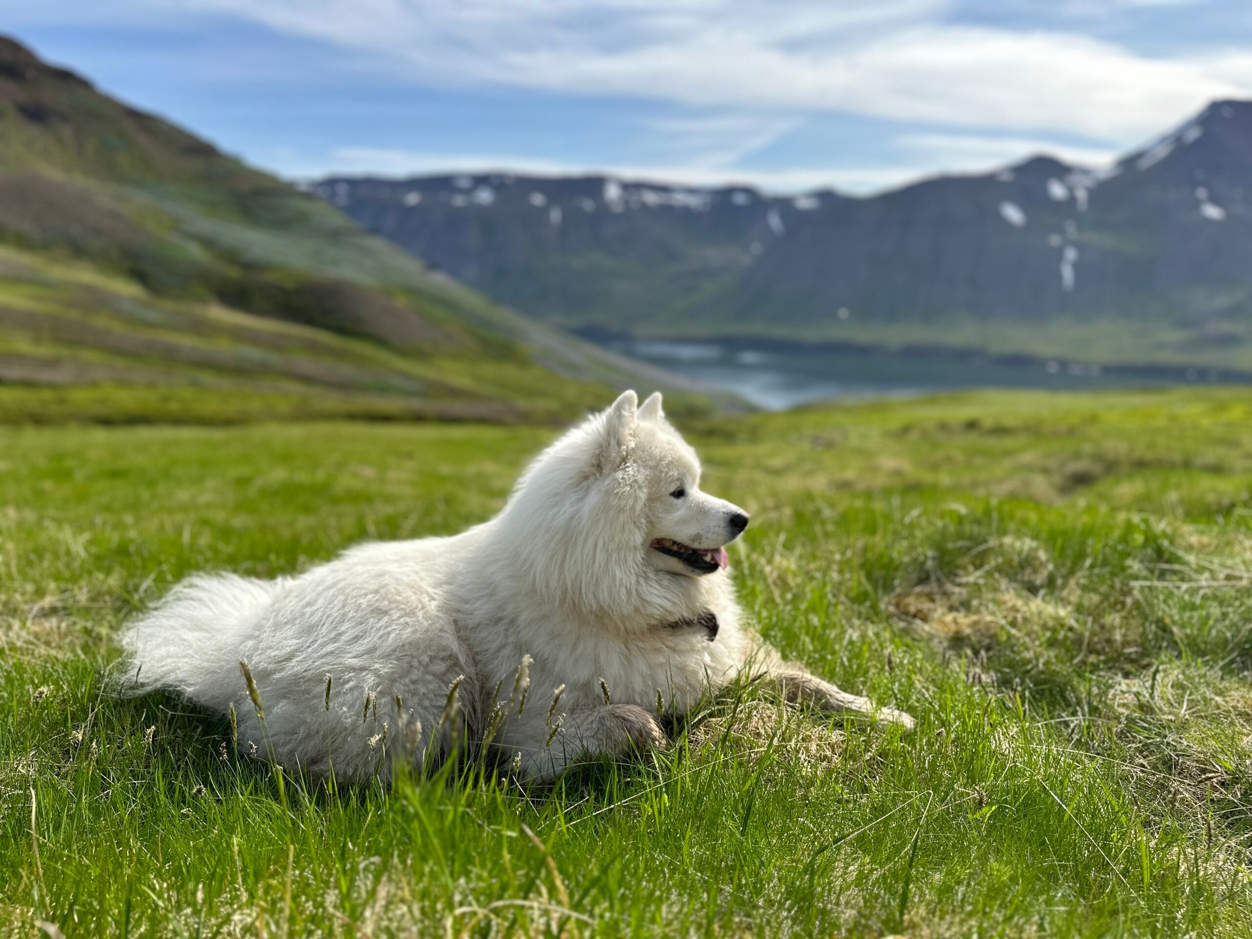Ekki eru það alltaf bara menn sem fara í ferðalag með Freyju Travel – stundum slæst með okkar ástsæli félagi, Sólon. Hann er hvítur og loðinn siberian samoyed, rúmlega sex ára gamall, og ávallt í góðu skapi.